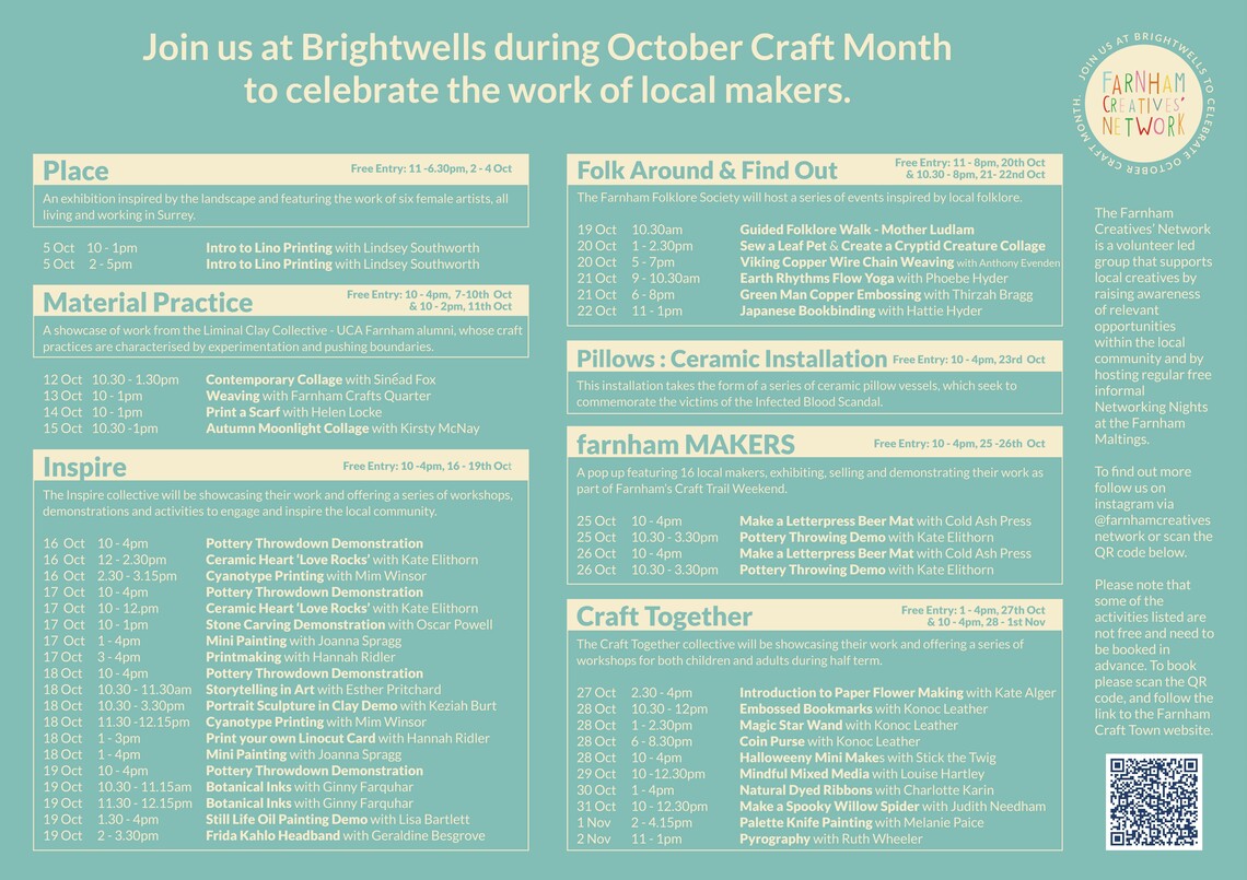 As part of Farnham Craft Month and thanks to the generous support of Brightwells, FCN are excited to bring their community together through a month-long programme of exhibitions, installations, workshops and demos. See farnhamcrafttown.com/events for full details.