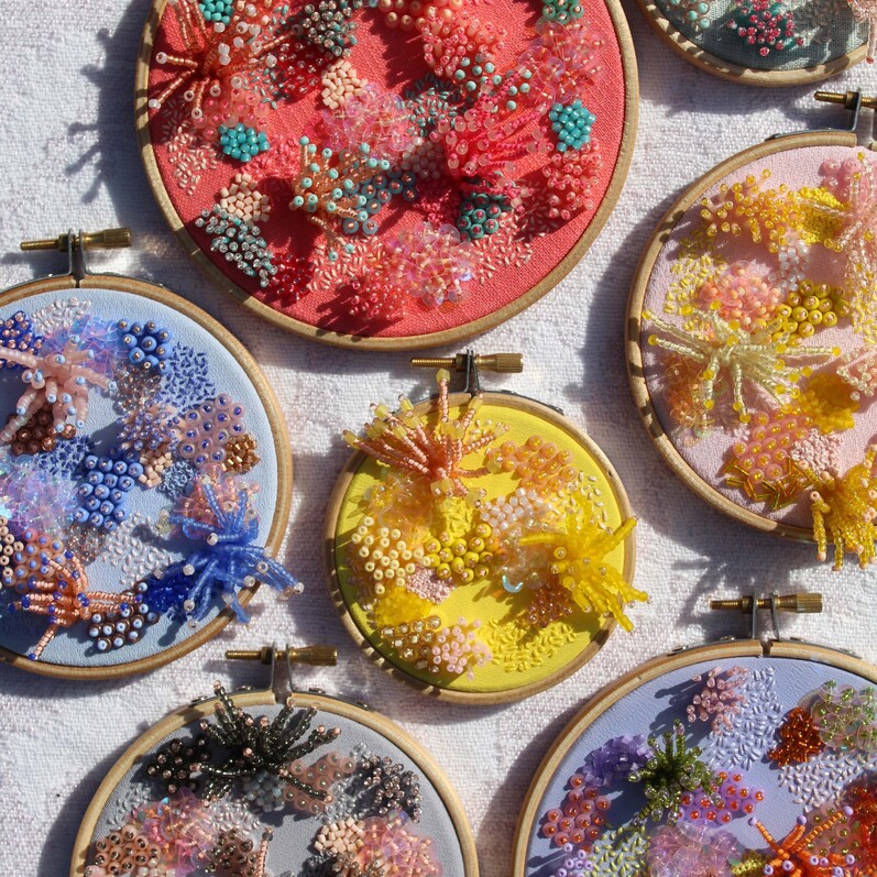 In this session you will learn a variety of 3D beading techniques to create your own embroidered coral world. You will have full assistance from Imogen to help you master each technique, and she will also be on hand to thread any needles throughout the workshop too!