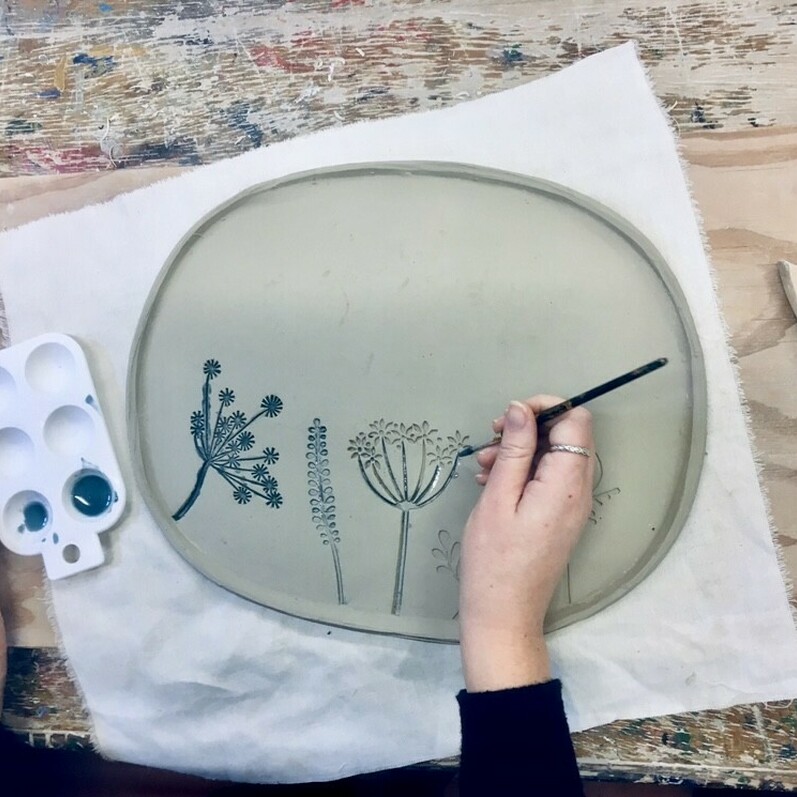 You can shape your platter, stamp, pattern and colour the surface, we will then glaze it on your behalf.