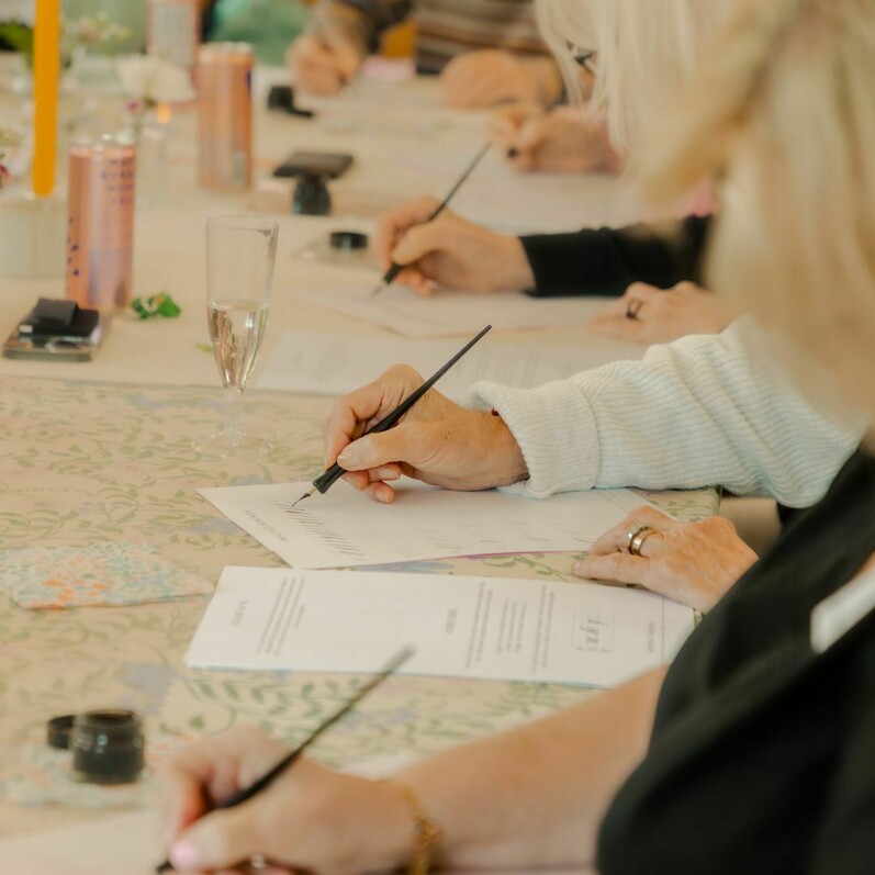 You will be given a welcome glass of Prosecco or soft drink of your choice, a calligraphy kit, including dip pen holder, nib, ink and worksheets, to use throughout the session, and a video to watch at home, which covers everything that will be taught in the session.