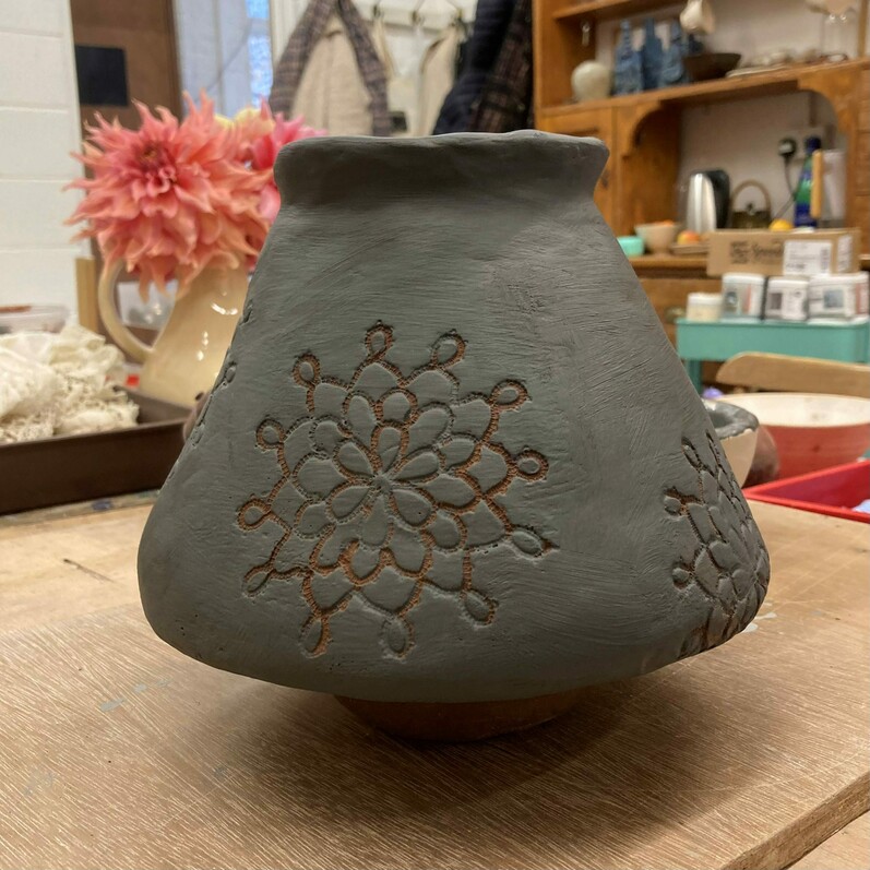 The use of wooden and textured hand tools gives pleasing results, further surface decoration achieved by using slips and resists will be explored.