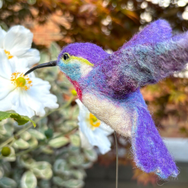 Needle felting, as well as being fun to do is also quite therapeutic and addictive! Continued poking with a special barbed needed into carded sheep wool will slowly transform the wool into a solid form of your design. You will receive step by step guidance from your tutor, Carol, to sculpt the wool into the required component shapes that you will then felt together to form the delightful hummingbird.
