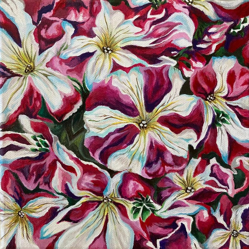 With vibrant fuchsia pinks and interesting shapes, we will cover observation using pencil drawing, then use a pink and white palette in acrylic paints, mixing tones and shades to create your very own petunia patterned painting. We will create the finishing touches with iridescent pearl white.