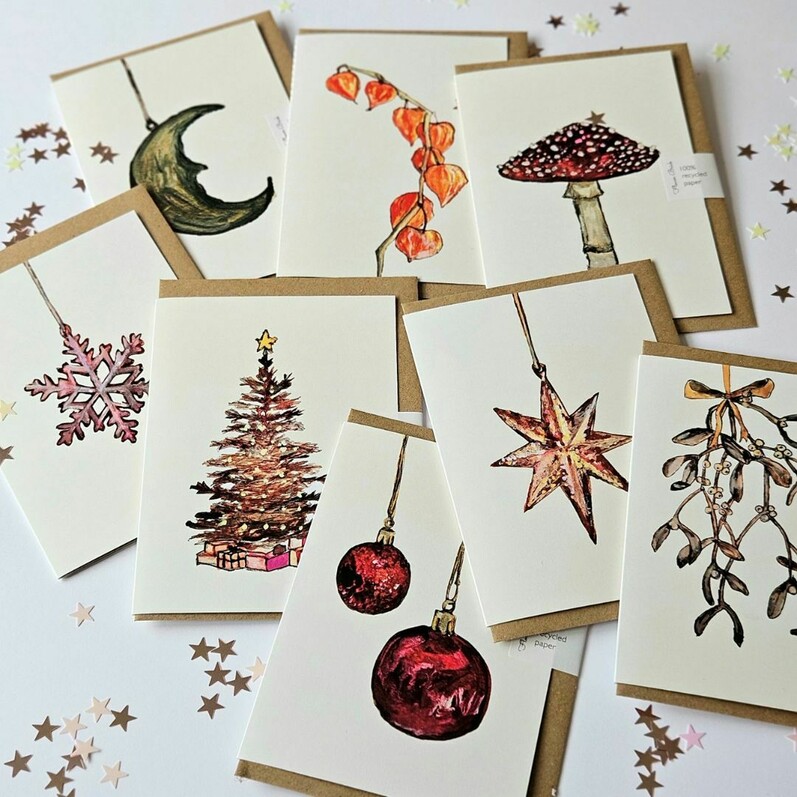 Working from seasonal foliage and decorations you will then be painting your own designs using walnut ink and watercolours onto recycled cards. Each of your cards will come with a recycled envelope and card catch sticker.