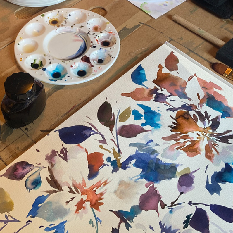 Learn to paint large loose watercolour florals using vibrant and intense watercolour inks with experienced print designer Sarah Metcalfe. We will master techniques such as 'wet-on-wet', blooming and use bleach and fine liners for great effects.