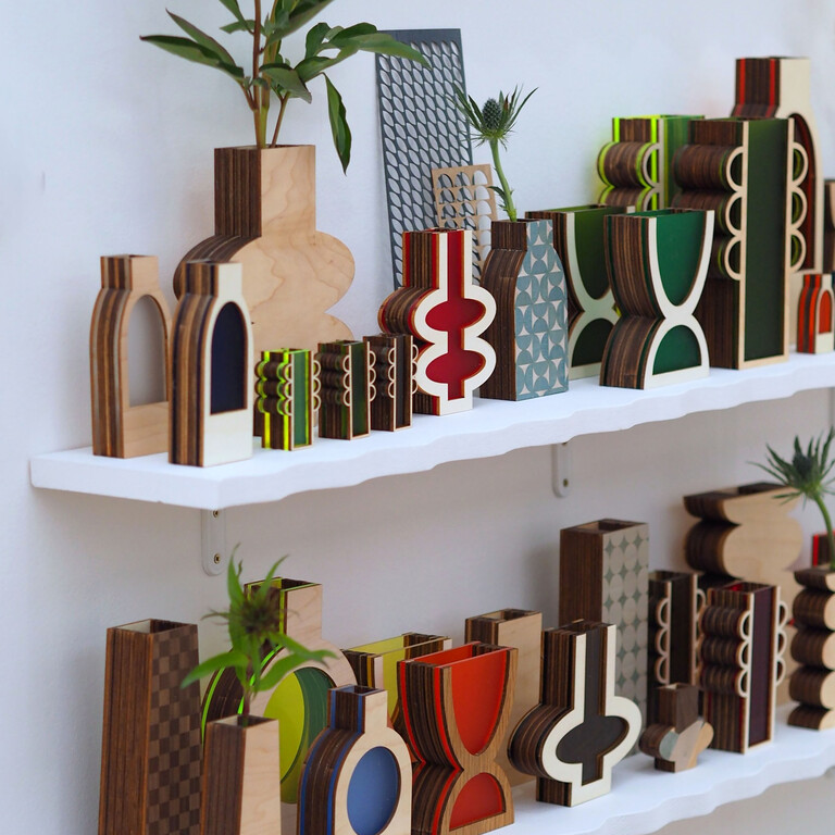 Breesha Partington creates laser-cut acrylic and plywood vases that blend clean geometric forms with a strong focus on materiality. Designed primarily for dried flowers, these versatile and sculptural vessels bring both functional and decorative value to a space. Each piece is crafted with precision, ensuring high quality and consistency. Breesha’s approach merges digital processes, like laser cutting, with traditional hand-assembly techniques, adding warmth.
