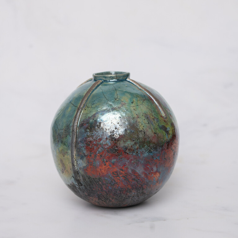 Inspired by the traditional Korean Moon Jar and the Moon herself, Debbie Page Ceramics explores the decorative possibilities arising from the application of organic materials, glaze and smoke working individually and in combination together on the ceramic surface. Debbie am particularly attracted to the contrast of shiny coloured glaze and the matt black of raku and ‘smoke-on-glaze’ techniques. Their work is hand built using white bodied clays, eg Ashraf Hanna or Studio White; they coil into moulds to aid building the forms, joining sections together. The ‘Pail vases’ have handles made from found wood, attached with raffia.