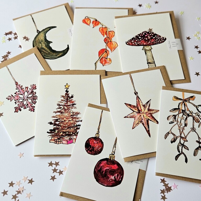 Sustainable Christmas cards, gift tags & art prints. Seasonal, hand painted designs, with watercolours and walnut ink. Printed on 100% recycled paper with vegetable oil ink.