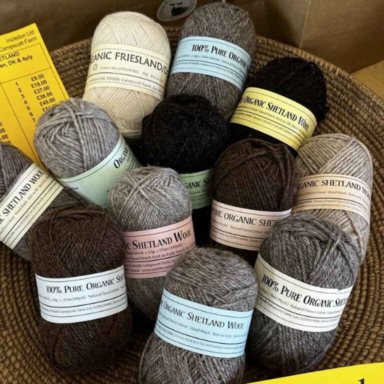 Middle Campscott is a small family run organic farm. Our Organic knitting wool in 4ply, DK and Aran is all from our organic farm flock mainly of coloured Shetlands, but also including Zwartbles, Frieslands and Dorsets. Every year we have new, natural tones of wool, as the colours of the sheep are different every year. We also sell the wool in knitting kits, with patterns designed by Karen, our daughter Emily and friends