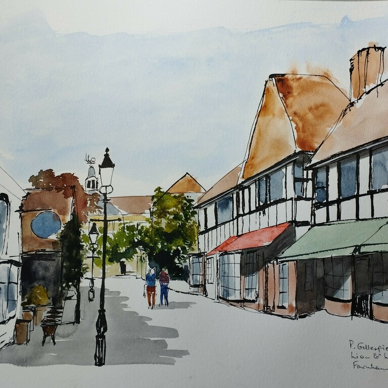 Urban sketches in ink and watercolour, primarily of Farnham, together with handmade pottery and fabric rugs.