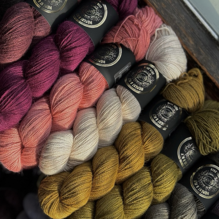 Hand dyed yarn inspired by art history and sketchbooks, complemented by handmade notions like candles, stitch markers, and illustrated project bags. Visit us for moody jewel toned yarns!