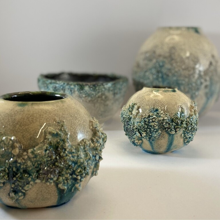 Processes involve the use of many hand forming techniques to create organic textural vessels that echo the ancient aesthetic of Wabi-Sabi and celebrate the imperfections and unpredictability of the ceramic making process. Surfaces undergo manipulations and textural additions and the pieces are glazed and fired - often multiple times using layering of oxides and glazes to further interact and alter the forms.